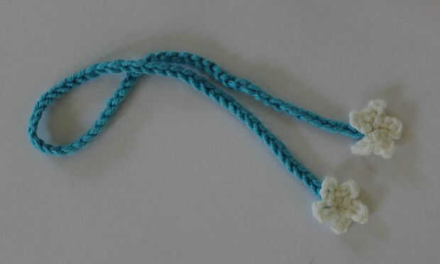 Cadena de 70, o tan larga como se ajusta alrededor de la cintura de la muñeca. Puede Agregar perlas o flores de ganchillo a los extremos si quieres. Pase la cadena a través de los espacios alrededor de la cintura. Su vestido se acaba! Ahora para la diadema y los zapatos.