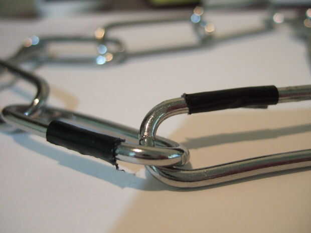 Cuadro 3 muestra uno de los eslabones de corte. Puesto que la Unión sería bajo mi cuello, decidí simplemente cubrir los cortes con alguna cinta adhesiva negra. También, sentí que sería útil tener una forma de despegar sin tener que mantener las teclas conmigo para desbloquear el candado en la parte delantera. Limpiar los cortes mucho con un poco de pulido, en el caso pero la cinta ofrece una protección adecuada de todos el peor afiladas pedacitos irregulares si no tienes uno.