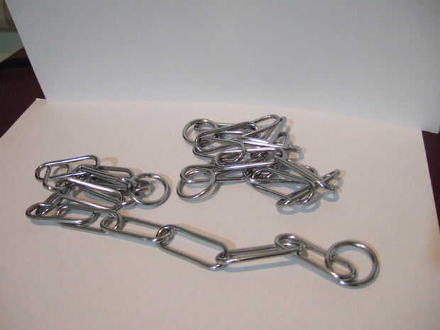 Yo estaba planeando en ir a la tienda de bricolaje para obtener una longitud de cadena, pero buscando otros elementos del traje en la tienda de $2, encontré dos cadenas de "choke" de perro va barato. Resulta que, esto funcionó hacia fuera perfectamente, como veremos más adelante. Si desea obtener una longitud corta para usted en la tienda de bricolaje, puede omitir este paso ya que implica modificar las cadenas de la estrangulación para nuestro propósito.