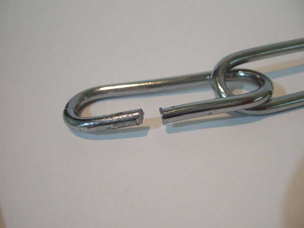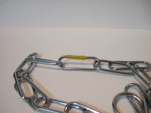 Como verá en la figura 2, marqué los eslabones de cada cadena que iba a cortar con cinta aislante amarillo. Esto funcionó bien para darme una pequeña compra con el disco de corte mientras que me metía comenzó.