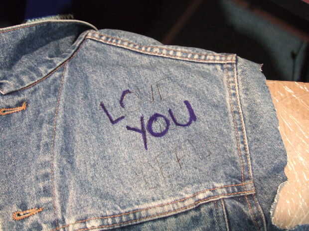 En primer lugar, escribí a los eslóganes sobre pedazos de papel, coloca sobre las partes de la chaqueta donde estarían, para tener una idea de la escala. Entonces escribí a las consignas en la chaqueta, muy ligeramente con un bolígrafo. Luego fui los contornos (en parte) con un marcador azul indeleble. (Foto 2)