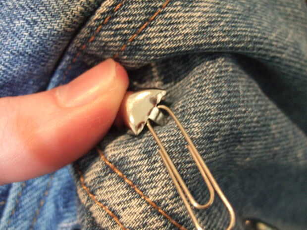 El perno que va aquí atrapará un clip de papel en uno de los dientes, entre el perno y la chaqueta. Mira las fotos para ver lo que me refiero. Hay cuatro puntos de anclaje para los clips de papel en todos. Dos a cada lado de la espalda de la chaqueta en las filas de montantes verticales corriendo hasta la parte trasera y dos más por encima de la costura horizontal, por encima de los dos primeros postes. Las imágenes deben aclarar lo que quiero decir con esto.