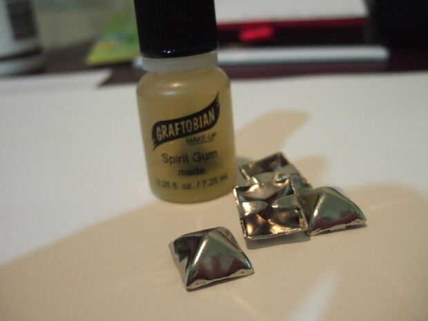 Para fijar los postes para mi frente, usé goma de espíritu. Compré esto en pequeñas cantidades de una tienda de disfraces online, pero probablemente usted podría encontrar en eBay o en una tienda de vestuario/teatro de ladrillos y mortero.