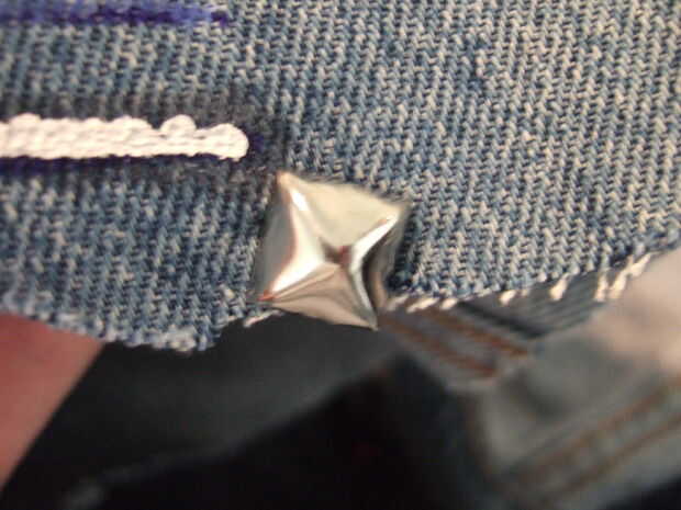 Por lo tanto, he marcado a un lado 4 de la pirámide espárragos que compré para la chaqueta. Se muestran aquí el proceso que he utilizado para preparar para la fijación en mi frente. El proceso debe ser transferible a los postes en forma de estrella si se pueden obtener, aunque teniendo 4/5 puntas, obviamente será ligeramente diferente para ellos.