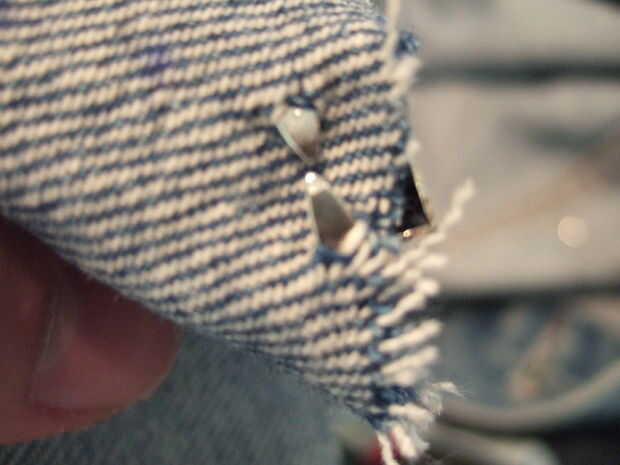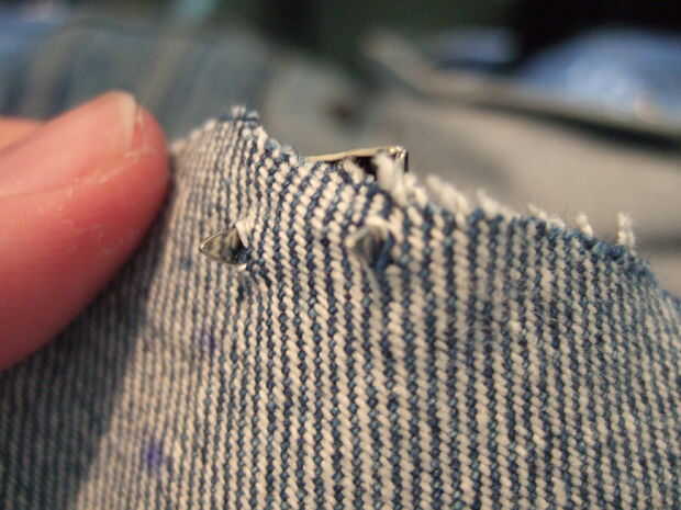 Básicamente, seguí el mismo procedimiento para la fijación de los montantes a la chaqueta, pero lo hice así en una de las mangas que había corte apagado y lo más cerca del borde de corte posible. (Doblando las puntas del perno encima es 100% más fácil una vez que se empuja el perno en la tela).