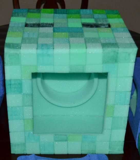 Ya que esta espuma se extiende necesita un círculo ligeramente más pequeño que el tamaño de la cabeza del niño o del adulto. Encontrar un recipiente que es ligeramente más pequeño que la cabeza del usuario. Colóquelo boca abajo y centrado en una de las plazas sin usar espuma de corte de 11 x 11. Marcar el círculo con su rotulador verde y cortar con la maquinilla de afeitar. Esta pieza se convertirá en el soporte de la cabeza caliente pegado dentro de la caja que acaba de crear.