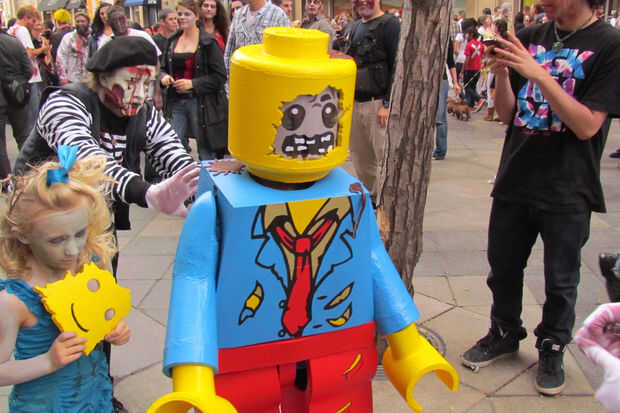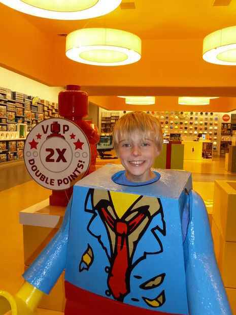 En Halloween, mi hijo decidió que algo visitaba la tienda de Lego en Denver (alrededor de 45 minutos en coche ida o vuelta) en su traje de pedir dulces por el vecindario. Las mandíbulas del personal caído y estaban contentos de dejarnos tomar fotos en la tienda, pasaron incluso una estatua minifigura de la ventana para que mi hijo podría posar con él.
