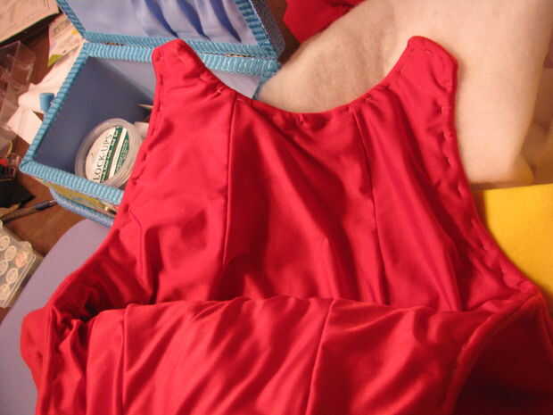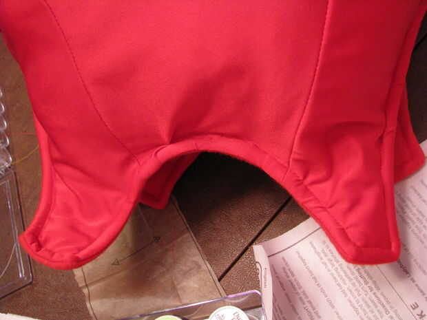 El cuerpo se terminó después de la cara. El traje de doble relleno. Había cosido un relleno de fibra de la guarnición en la cáscara, adjunta a la guarnición del satén y luego rellena el pájaro. Tuvimos que jugar con la cantidad de relleno para hacer las cosas bien. La guarnición del satén se cose alrededor de los bordes y el relleno polivinílico está suelto en el cuerpo. Funcionó a la perfección para conseguir la forma que queríamos. La guarnición era un toque agradable ya que permite el traje deslizarse dentro y fuera muy fácilmente. Velcro fue cosido en las correas de hombro y el ajuste tiene el traje en su lugar.
