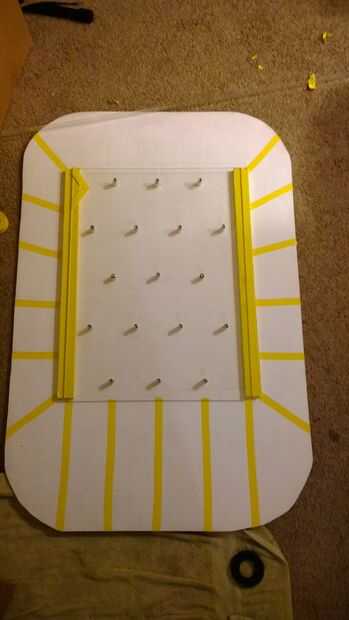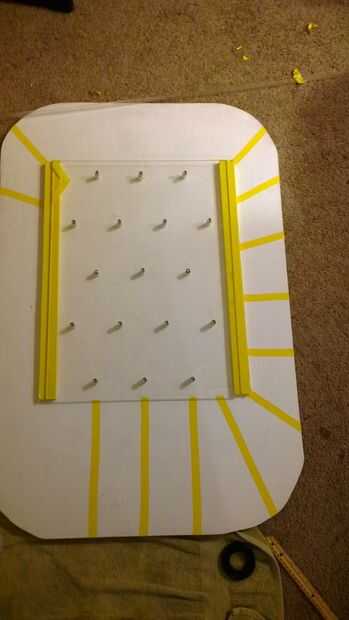En la imagen, los dos círculos negros son los chips de Plinko que están específicamente para esta tarjeta de tamaño, principalmente debido a su 1/4" de espesor y su peso (cómo salta alrededor cuando sale espaciadores de nylon).