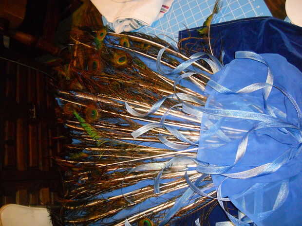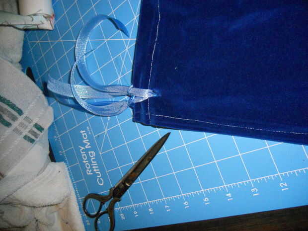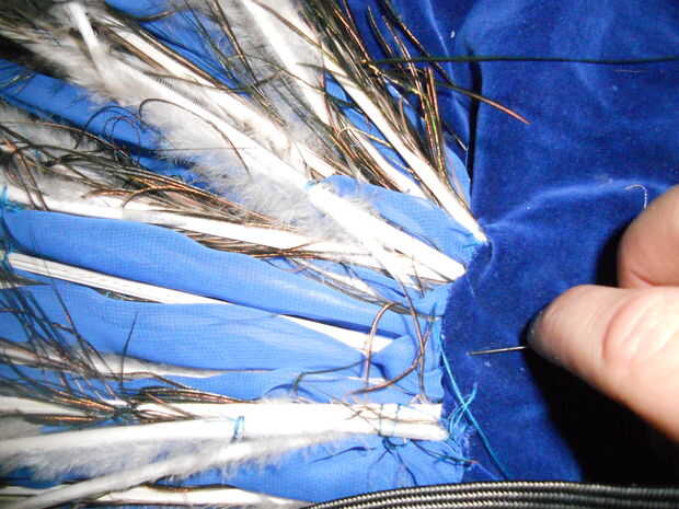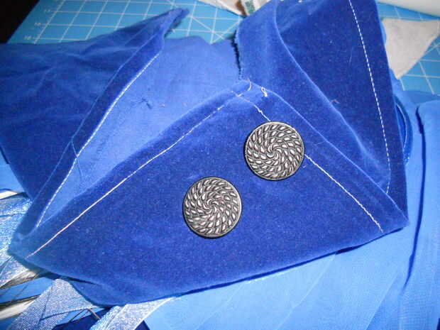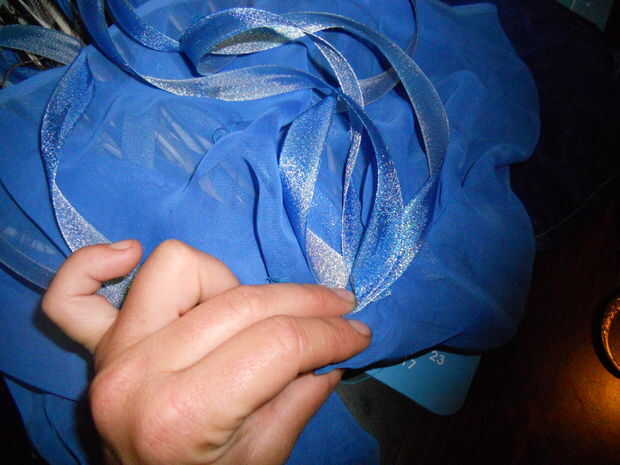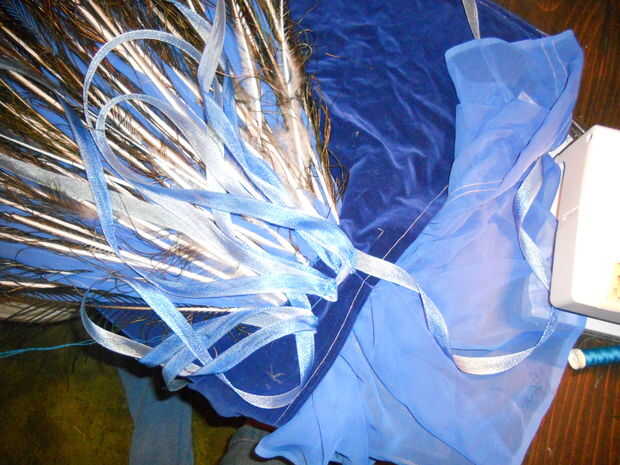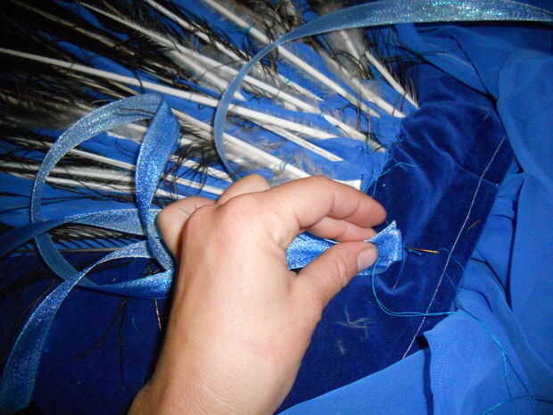 Entonces, nuestra su cinta azul y hacer grandes lazos que cuelgue hacia abajo cerca de la mitad de la longitud de sus plumas. Coser la cinta en la falda justo por encima de la raja en el terciopelo.