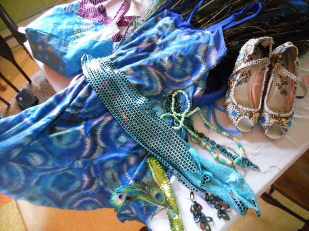 -accesorios de llamativo pavo real: Abalorios collares en azules y verdes, pendientes, zapatos lindos, diadema con plumas de pavo real fijada