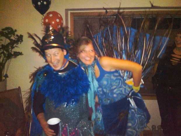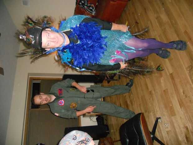 Para acabar este traje, fuimos con unos pies de pájaro, mallas moradas, un top azul con lentejuelas con una boa de plumas azul para hacer pelo en pecho birdy y un sombrero de bobby (no preguntarme por qué, parecía caber).