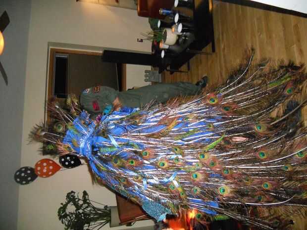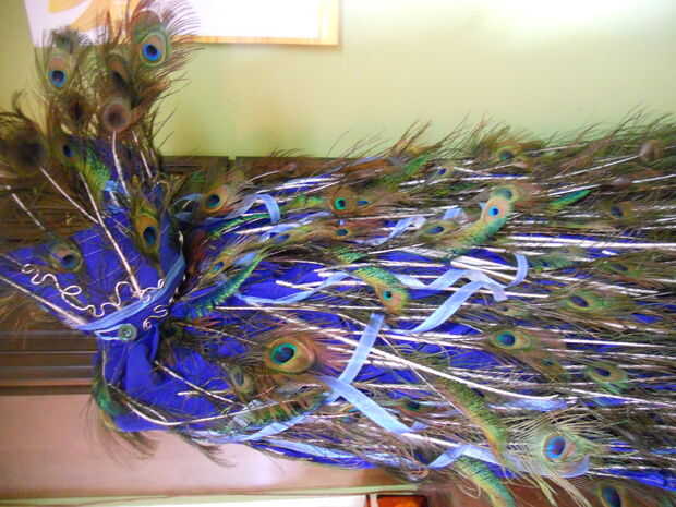 Nos habíamos planeado hacer una capa de plumas de pavo real, de la misma manera como la falda de pavo real, pero más largo y con un collar. Para hacer el cabo, siga los pasos 1-3 pero comienzan con las plumas que sobresale unos 3 pies de la parte inferior de la tela (yo usé a una tela de Satén tipo pesada). Esto le llevará mucho más plumas... por lo menos 75-100.