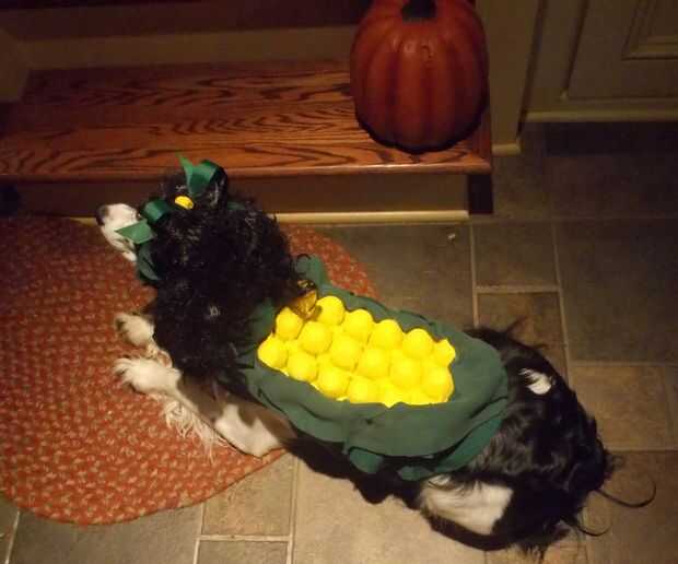 El cuerpo fue formado fuera de una sudadera vieja de mi marido. I patrón de mirar a un perro chaleco manta, corte "manta o chaqueta" de la sudadera con pestañas y añadido tiras de velcro en la parte trasera, media y pecho para adaptarse a nuestro perro. Para los "granos de maíz" pintó un cartón de huevos y caliente pegan a la "manta" o espalda. I cortar hojas y había los había pegado así.