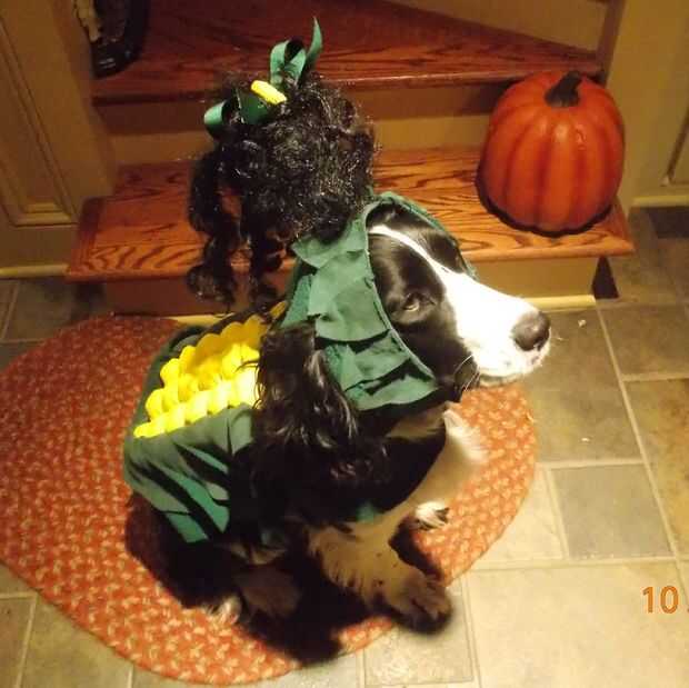 El vestido principal era un cono de Junta de cartel, envuelto en hilos peluca negro y pegado a una capilla hecha de la manga de la sudadera con elástico cosido en para que se ajuste alrededor de la cara de nuestro perro, Miss Sophie Paws. He añadido un lazo verde y un adorno de mini maíz que hice de arcilla Sculpty.