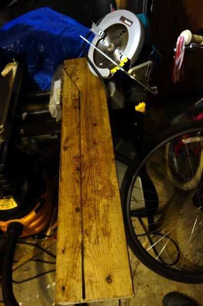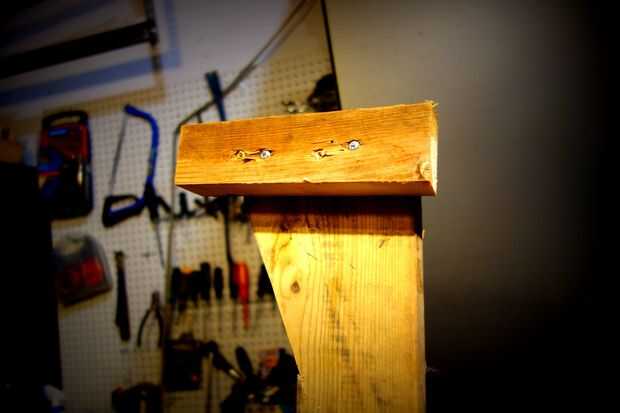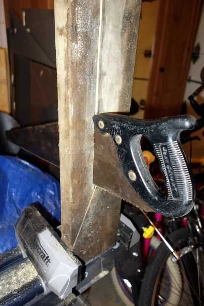He elegido para 29" altura de los zancos que pueden ser un poco altos para un principiante (he hecho un poco en el pasado). 2 x 6 fueron cortadas longitudinalmente a cerca de 3 pulgadas con una sierra circular para reducir peso; la parte superior de la pieza quedó a las completas 5.5 pulgadas. Utilicé una sierra de mano para terminar los cortes para evitar debilitar el apoyo empujando los cortes para completarlos. Uno de estos soportes mostró algunas grietas a lo largo de los granos, así que poner unos tornillos de madera largos a través de las grietas después de una perforación previa.