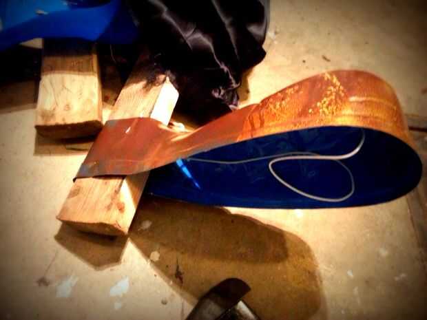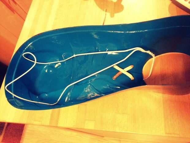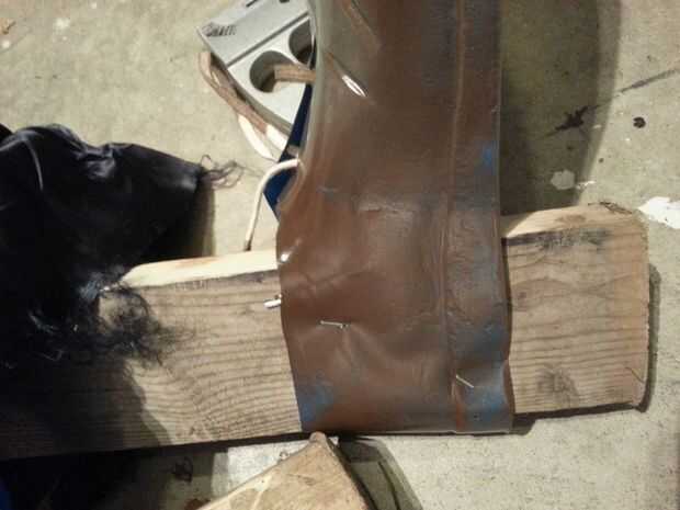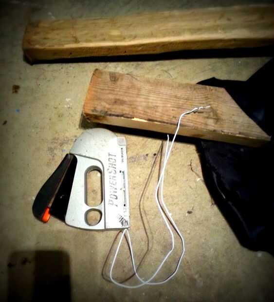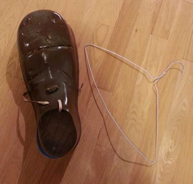 Compré algunos payaso zapatos desde el almacén del dólar, lijada la superficie para aumentar la adherencia de la pintura. Luego pinté con todo lo que tenía en mano, he usado el gris para dar textura extra un poco. El plástico del zapato no era lo suficientemente rígido para mantener su forma, así que dobló una suspensión en forma y había grapada a la Cigüeñuela. Me preocupaba tropezar en el artilugio por lo que había planteado unas pocas pulgadas de la base.