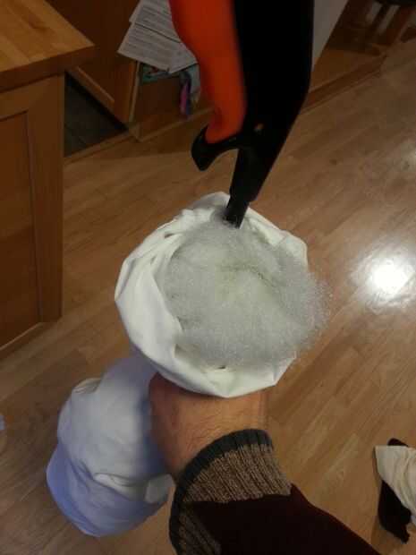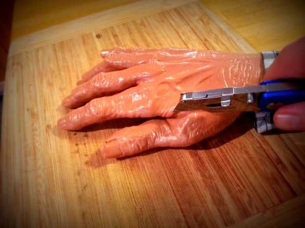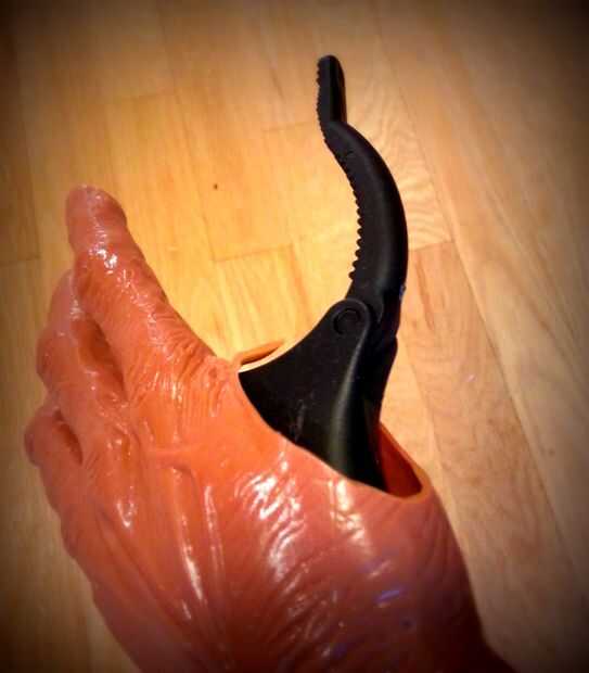 Quería tamaño de biggie mi parte superior del cuerpo, de lo contrario, eres un huevón en zancos. Compré unas manos falsas y algunos especuladores de la tienda de dólar. Vaciar el relleno y cortar los pulgares de las manos. Inserte a los glotones en las manos con un lado en el índice y el otro el agujero del pulgar. Llene el pulgar con pegamento artesanal y pegarlo en el otro lado de grabber. La brecha con algunos curitas para ocultar al grabber expuesto. Cubrir al grabber con algunos mangas y rellene con un bateo.