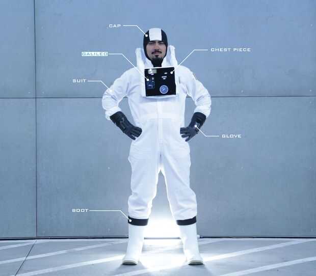El traje se compone de cinco componentes principales: la pechera, guantes, botas, un gorro y el traje sí mismo.
