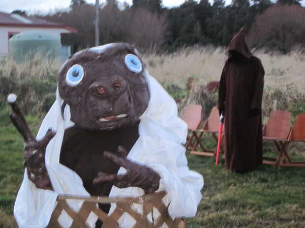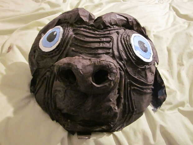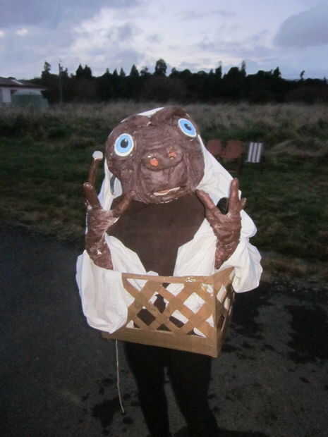 este traje casero de ET se hizo de una pelota de rugby mached papel. Hice 3 capas de papel maché y dejar secar durante la noche. Después de que fuera seco, corte la bola desde el fondo y parte trasera. Se ha añadido un trozo de cartón al frente para la estabilidad y que ha ayudado a dar forma a la boca y la nariz. Para la nariz, utilicé un cartón cáscara de huevo cartón y parecía que cuando la traje estaba en. Para llevar a cabo las funciones de la cara, yo rodé bolsas de plástico y poner cinta de embalaje pesado sobre él, grabando para el papel maché. Las bolsas de plástico fueron especialmente importantes para la estructura por encima de los ojos. A continuación, para que las arrugas faciales de ET, utiliza cadena gruesa y caliente pegado alrededor de los contornos de los ojos y la boca. Después de eso, era tiempo para un montón de pintura marrón y hacer las bolas de ojo de cartón y pintura.
