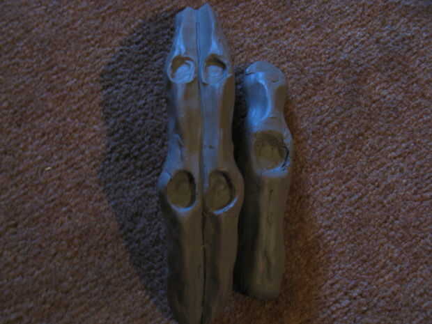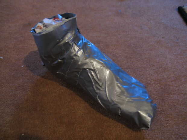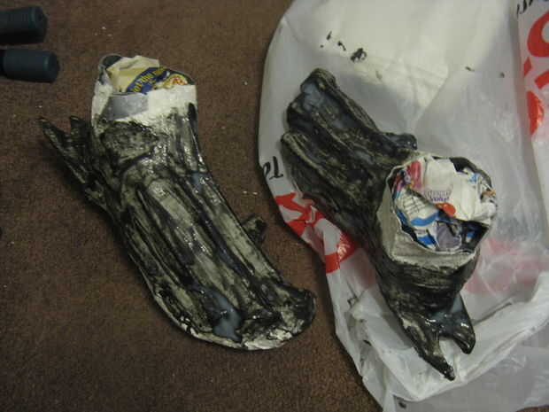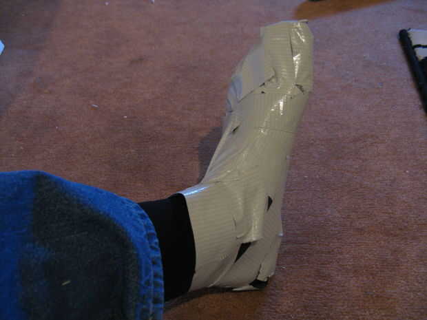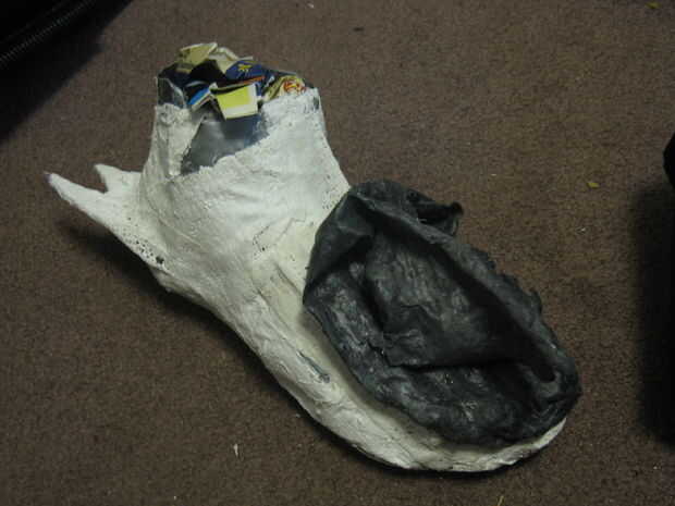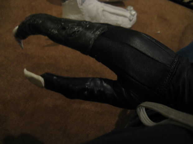 Para los pies, empecé por hacer un "cast" de mi pie con cinta adhesiva. I luego despegó este elenco, relleno de periódico y enlucidos con yeso. Entonces sería capaz de usar papel de aluminio o pedazos de tablero de la espuma para acumular información y forma de pie. Entonces había cubierto todo con más tiras de escayola y había alisado hacia fuera. Luego pinté capas de látex (teñido de negro) en ellos. Había pintado alrededor de 10 capas o así sucesivamente, entonces había pelado apagado. Entonces pude pegar estas en los zapatos, que eran zapatos de agua negro apretado. Las garras fueron hechas de una pieza de tablero de espuma cubierto con yeso. Opté por en vez de Sculpey para que sean más fáciles de a pie en el suelo y evitar potencialmente agrietamiento o fractura.
