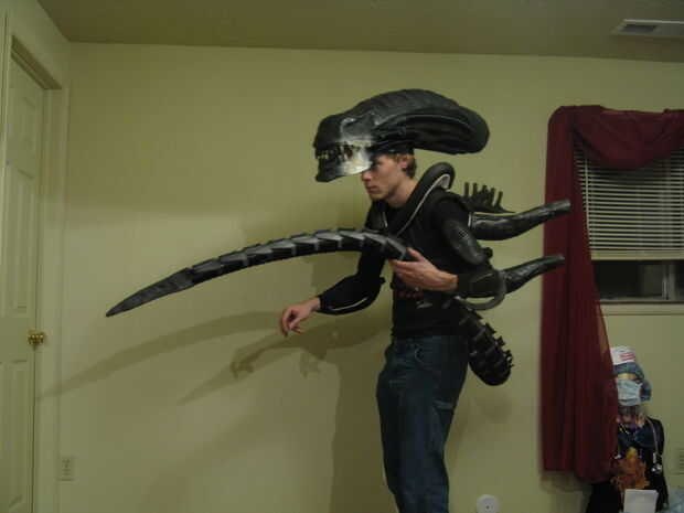 La cola iba inicialmente a ser un fideo de agua (similar a mi anterior traje alienígena y también la reina), pero como yo estaba vagando a través de la tienda, me ha pasado con algún aislamiento de la pipa de espuma suave y flexible en lugar de la textura "espumosa" rígida regular que me acostumbré a ver. Hice un extremo de la cola más delgado, para darle alguna forma. Tomé unas hojas de foamie sticky back, cortarlas en tiras de cuarto de pulgada y había unido a lo largo de la cola. Largo y tedioso, tardamos unas 2 horas más o menos. Entonces agregué algunas tiras de cinta aislante y cinta aislante a lo largo de la longitud. Cortar algunas piezas fuera del tablero de la espuma de las "escalas" y me los pega caliente en. Hice un punto extremo de tablero de la espuma cubierta con tiras de yeso y había pegado sobre la punta. Con la ayuda de algunos Velcro agregado sobre la base de la cola, sería fácilmente desmontable de la pieza de la caja torácica/torso.
