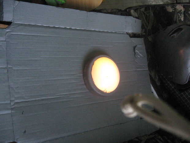 toma su luz del grifo y cubrir la parte de luz real (la parte que empujas para activar) y tapar con cinta de enmascarar. una capa de spray de pintura de aerosol metálica plata de cerrar y dejar secar. Rocíe los lados y si lo desea, la parte inferior. entonces conducto cinta adhesiva donde debe ir el reactor de arco. debe ser un lugar en el área del pecho, si tu no está seguro, encontrar una foto en google.