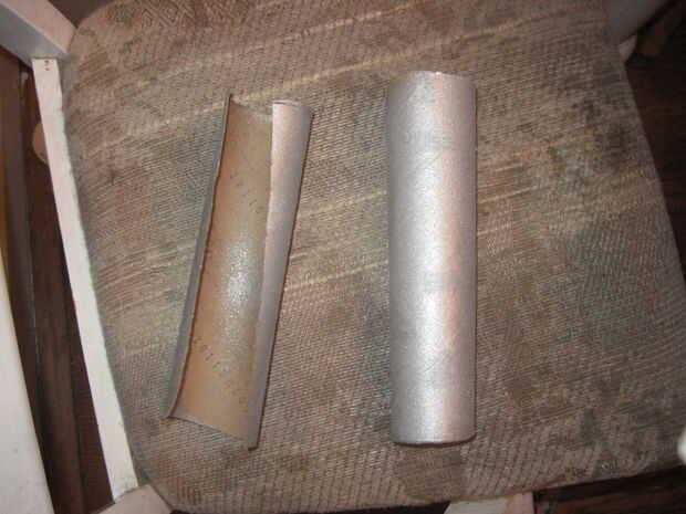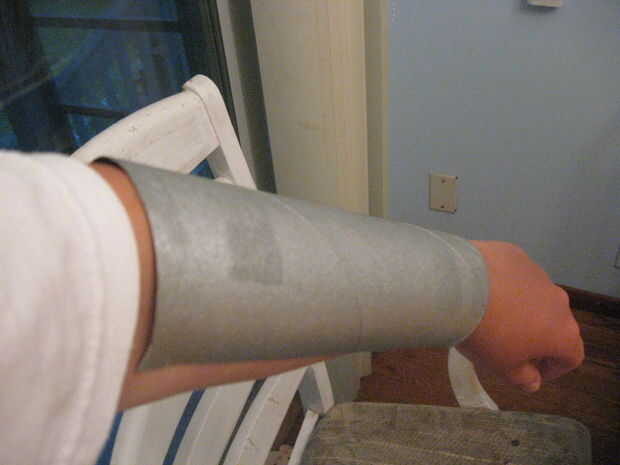 Tomar sus dos tubos de cartón y corte longwise tan cabrá en tu brazo antes. como en las fotos. recorte para que pueda doblar el codo y luego hacer una capa de plata pintura de aerosol metálica de cerca.