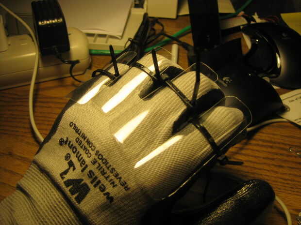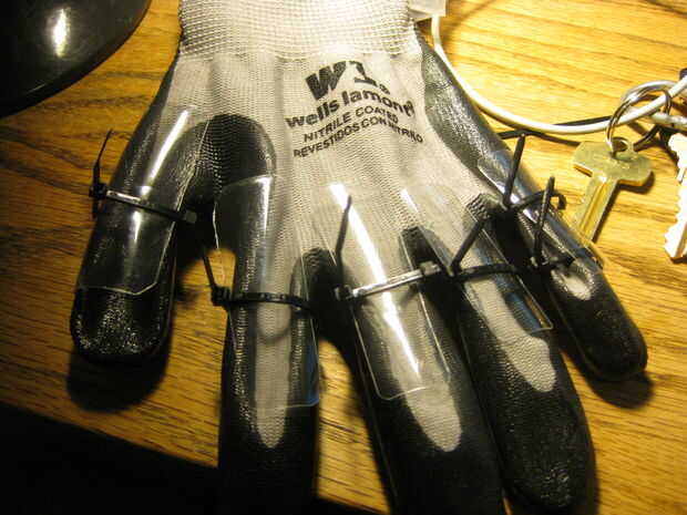 Hacer pequeños lazos con los lazos zip, ponerlos en los dedos. Use los dos si algunos dedos son demasiado gruesos. Deslice los pedacitos de plástico por debajo. Pegamento caliente a virar en su lugar.