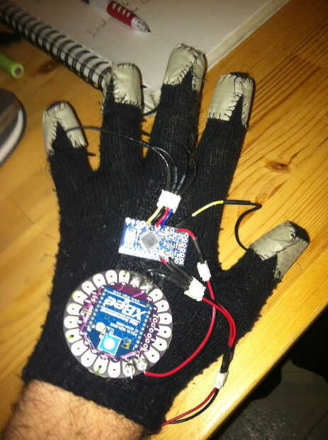 Corte las tiras de tela conductora y pegado alambre entre dos piezas. Cosí a la tela a las puntas de los dedos de un guante. Hice el pulgar el suelo y cada dedo en un diverso perno. El programa en el arduino es un botón básico programa de detección. Cuando el circuito está conectado, un mensaje es enviado a través de lo xbee a los LEDs. Lo cool es que detecta si tocan dos, tres o las cuatro dedos dándome dedo diferentes 15 tocar combinaciones.