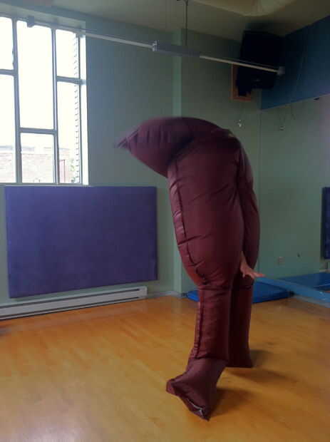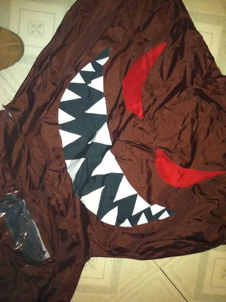 Pegué en la tela de nylon ligero para decorar la cara. No coser a porque no quiero poner más agujeros donde podría salir aire. Después de darse cuenta que no podía ver nada, cosí en una ventana de plástico transparente con malla negra detrás de él. También hace su cabeza más pequeña, piernas más cortas y había añadido los brazos.