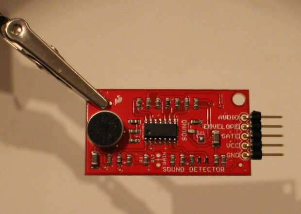 Conecte el detector de sonido VCC y pernos de tierra para el VCC y tierra pines en EL secuenciador. Conecte la salida de puerta detector de sonido a la clavija de entrada de A2 en EL secuenciador. Si está utilizando los sobres y las señales de salida de audio, conectar estos pines A3 y A4 en EL secuenciador (más sobre esto en el programa ella! sección).