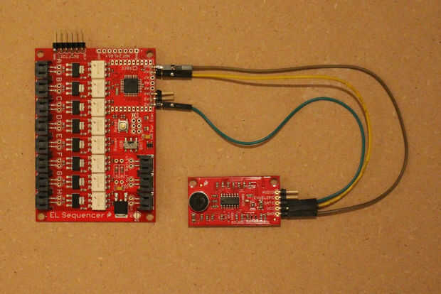 4. Conecte el detector de sonido para EL secuenciador vía cables de protoboard a la hembra (o alambre en los pasadores de la rúbrica de la soldadura).