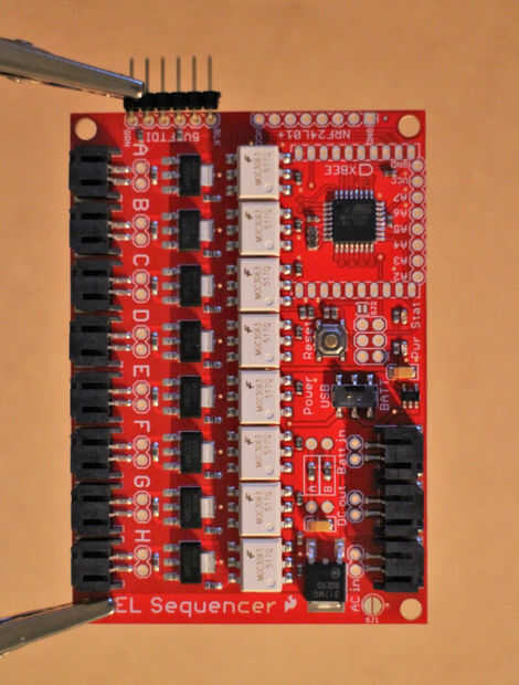 PRECAUCIÓN: Aunque es poco corriente, EL cable funciona en alto voltaje AC (100 VCA). Allí se exponen las conexiones en el secuenciador EL tablero tan cuidadoso al manipular el tablero. Siempre doble (y triple) Compruebe que el interruptor está apagado antes de tocar cualquier parte de la Junta. Para proyectos fin de carrera, se recomienda para recubrir todas las conexiones expuestas de epoxy, pegamento, cinta aislante u otro material aislante.