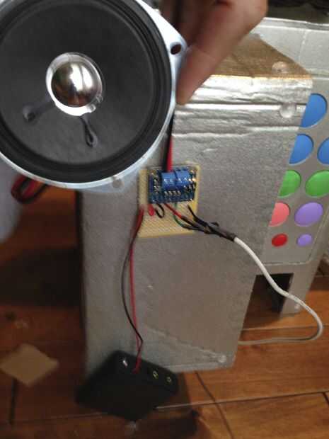 Usted puede haber notado un púrpura iPhone dock en pasos anteriores que estaba usando hasta el último minuto para los altavoces. Era terriblemente pesado pero el amplificador del altavoz que quería de Adafruit fue pedido en espera. Lo consegui con días de sobra y terminó por reemplazar el reproductor de mp3 con la solución de altavoz/amplificador personalizado dentro de horas de truco o el tratamiento y al hacerlo reducen su peso y tamaño por al menos el 50%. Hice un pequeño circuito en perf board para el amplificador y los cables diferentes para mantenerlo ordenado y fuerte. Corté uno de los dos extremos macho fuera el cable de auricular estéreo que tenía y soldar los cables de altavoz de su poder, izquierda, altavoz y mi poder y tierra de los cables a un pedazo de tablero de perf. Había soldado también energía de la batería y los cables de tierra en el circuito. Utilicé los pernos suministrados encabezado para el circuito del amplificador y soldar ese circuito a la Junta de perf así. Los cables del altavoz sólo se atornillan en los puertos altavoz izquierdo. Decidí que uno de los oradores fue bastante fuerte y no termina con el segundo ponente, tuve que reducir peso y probablemente de la energía. El protector de la onda sólo es compatible con archivos de sonido Mono de todos modos.