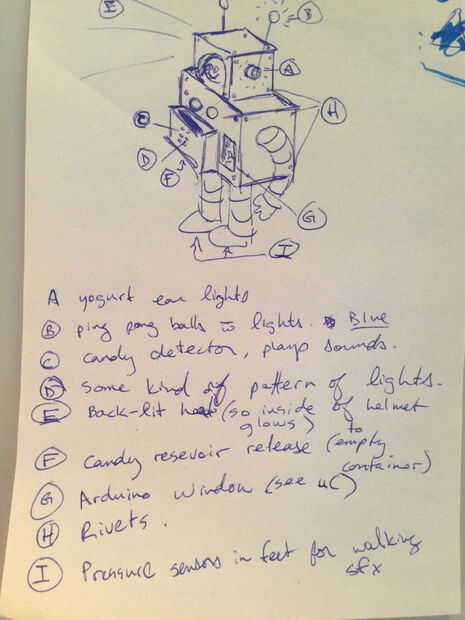 Esbozado algunos conceptos. La parte más difícil era dar con un diseño de casco. Quería un look retro, cuadrado. Para un de cuatro años de edad, no quería que nada pesado que su cuello debe apoyar, por lo que optó por separado casco y me fui con uno que fue apoyado por el torso con un gran "agujero del ratón" abrir para el rostro. Esto también le permitió la mejor visión. Muchos diseños de casco fresco obscurecer visión mucho. Todavía acabó tener que ayudarla a navegar escaleras y caminar pasados encintados y otros peligros que disparan porque ella no podía ver sus pies.