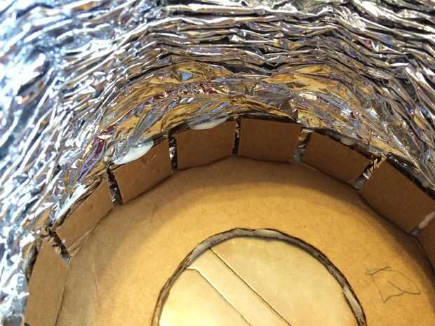 Para las manos encontré unos guantes de bajo costo en Lowes. Yo pensaba que necesitaría pintar un par de guantes pero estos ya estaban negro y plata por lo que no necesitan mucha modificación. Uno de los objetivos era que una interfaz limpia entre el extremo del brazo y el guante. Terminé creando una tapa para poner en el extremo del brazo con un agujero para el guante. Primero se corta 3 círculos de cartón que te estoy llamando un "adaptador de guante". Pegué las 3 capas juntos asegurándose de que la corrugación del cartón fue girados 90 grados para cada capa con el fin de hacerlo más fuerte. Una vez seco el pegamento de las capas luego pegué el anillo recién formado en la muñeca del guante. Luego cortar la "muñeca" de cartón y plegar las lengüetas. Esta parte es poner en el extremo del brazo para formar la base de la tapa. Puse el cartón en el extremo del brazo sin pegamento y luego dobla cada pestaña de la ventilación con el fin de poner una gota de pegamento del gorila en él. Luego cortar la placa de"muñeca" de cartón y pegado a la parte exterior de la "muñeca" para reforzarlo. El adaptador de"guante" es lo suficientemente grande para evitar que el guante que sale del brazo y el elástico en la muñeca del guante lo mantiene en su lugar.