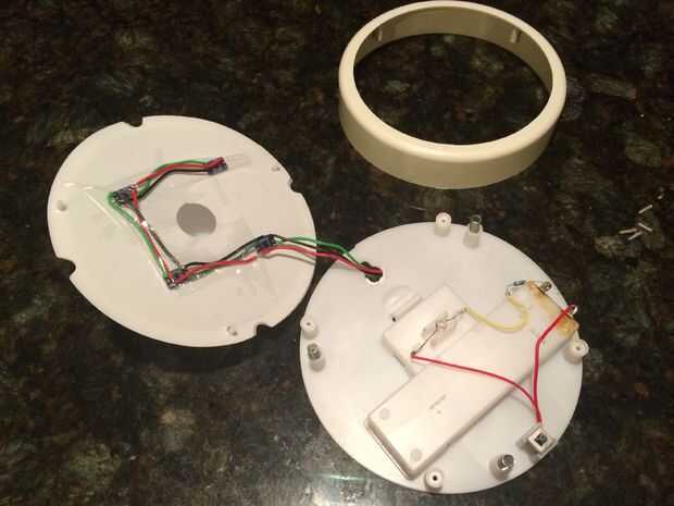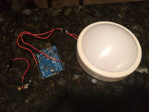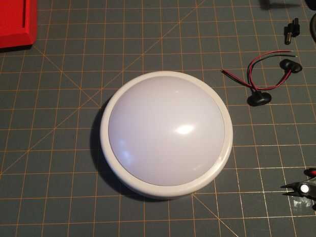 Compré una luz de empuje alimentado por batería. Podría utilizarlo como es, pero decidí añadir un poco más de una pantalla de luz. Compró un Neopixels y un Arduino Adafruit. Hay algunos grandes tutoriales sobre Adafruit. Los Neopixels son LEDs RGB con controladores de y luego el Arduino se utiliza para animarlos. Tiempo era limitado así que sólo usé el código de ejemplo proporcionado en la Adafruit. Adjunto es un PDF de la plantilla que usé para cortar los agujeros para el Neopixels.