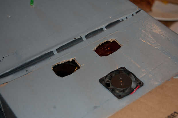 Para ver de mi traje, necesitaba algún tipo de lentes polarizados. Lo único que tenían en mano en el momento era un sistema barato de gafas 3d. No es la opción ideal. Si tuviera más tiempo, habría utilizado una malla fina ventana, puesto que fácilmente sería capaz de ver hacia fuera (porque sería buscar a través de a una distancia más cercana) y todos los demás tendrían problemas para ver en. Para empezar, yo diseño y corte dos agujeros para las lentes, de deslizamiento de la cabeza del traje sobre mi cabeza para comprobar la altura cómoda para las lentes. Luego había grabado las lentes en su lugar dentro de la cabeza.