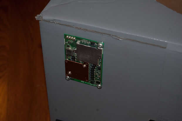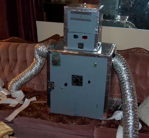 Si usted ha seguido a través de todos los pasos anteriores (o los que usted elija incluir), ahora debe ser capaz de añadir los toques finales al cuerpo! Yo empezar empernando más antigua computadora circuitos por todo el cuerpo. También corte dos ranuras en el hombro del cuerpo que acepta dos tarjetas RAM. Si decide hacerlo, asegúrese de que estas ranuras son paralelas al borde del cuerpo, me imagino que las ranuras no paralelas no iba a hacer un robot de aspecto muy elegante. La siguiente y final de lo que hago es añadir una cinta de papel de aluminio-bandas de borde a lo largo de los bordes del cuerpo de la robusteza (excepto la inferior). Yo doble la cinta alrededor de los bordes, así que la mitad de su ancho en cada cara del cuerpo, como se muestra en la foto.