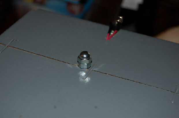 pensé que mi traje de robot requiere algún tipo de antena como el dispositivo, así que pensé algo rápido (esto fue en el día de Halloween) y una tuerca de vino a la mente, tiene la mirada industrial bonita fui a con mi traje. Penetra un agujero en el centro de la cara superior de la cabeza que estaba sobre un 1/4" de diámetro o menos y pone un perno de 3/4" a través del interior, atornillar una tuerca hexagonal y la tuerca. Luego añadir el mismo decorativo "Cinta de papel de aluminio" bandas de borde alrededor de todos los bordes (excepto la parte inferior) de la cabeza. Os adjunto también la bahía de barra de visión empujando los agujeros para los tornillos y pernos en.