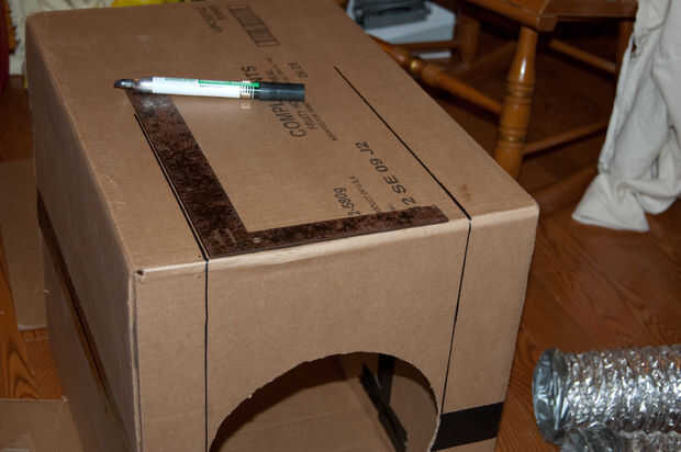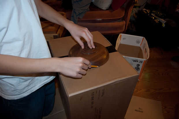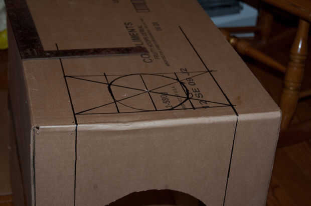 Usando un tazón de madera cumplí, yo diseño la cabeza del agujero (ver figura #1). El recipiente fue el diámetro perfecto para mi cabeza. Un compás de dibujo Círculo también podría usarse así como cualquier tipo de plato redondo-ware o un objeto de diámetro correcto. En este punto que son capaces de cortar el agujero de la cabeza si lo prefieres (ver cuadro #2). Luego, utilizando un cuadrado, trazar líneas van desde los bordes de los lados que se encuentran con el agujero de la cabeza todo el camino en la parte superior (ver figura #3). Luego, dibujé línea verdadera de a los lados, que se extiende en la parte superior (ver figura #4). Hacer 1" marca de la parte superior y con una línea de cuadrados de usando esa marca como una medida para la línea del hombro de mi corte (ver figura #5). En esa línea, de hacer una marca de 4-1/4" abajo (el diámetro de los brazos). Si los pasos anteriores se realizaron correctamente, debería ver un rectángulo marcado hacia fuera en los lados de la caja. Entonces marque el centro del rectángulo, dibujando líneas rectas de esquina a esquina (ver cuadro #6). Después de que yo dibuje una línea cuadrada derecha a través del centro (vertical, ver figura #7). Entonces, marcan 2-1/8" hacia fuera de cada lado de esta línea (el diámetro de la tubería de brazo dividido por 2). Después, me marca a las líneas cuadradas hacia abajo de los puntos 2-1/8"(ver imagen #8). Luego, utilizando una brújula, o la tapa de un recipiente de diámetro correcto, utilice la pequeña plaza en el centro al centro de mi brazo del agujero (ver figura #9). Esto se hace para el otro lado, luego se cortan los agujeros hacia fuera (ver figura #10).