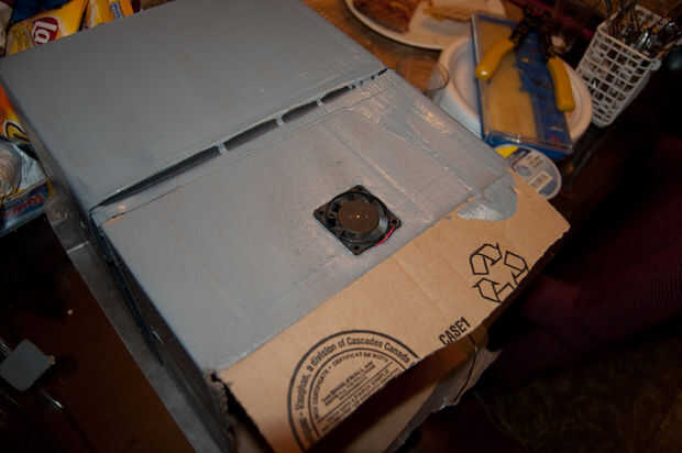 decidí instalar ventiladores de ordenador en la cabeza y el cuerpo de mi traje ya que puede conseguir muy caliente allí. Empezar con la cabeza puesta-hacia fuera un agujero centrado cerca del borde inferior de la cabeza. El agujero es del tamaño adecuado para aceptar el ventilador. Luego cortar el agujero y ajuste el ventilador. Debe ser lo suficientemente apretada como para sostener el ventilador en su lugar sin la ayuda de pegamento o sujetadores. Lo mismo se hace para el interruptor, que se encuentra en el lado de la cabeza. Luego de cinta una batería de 9 voltios dentro de la cabeza. El cable positivo de la batería va al interruptor y el cable negativo quede aplastado junto con los negativos en el ventilador. El cable positivo del ventilador también va al interruptor. Tenga en cuenta, todos los cables en el traje son pegados a un lado. Nota: los fans soplan aire fresco y frío en el traje!