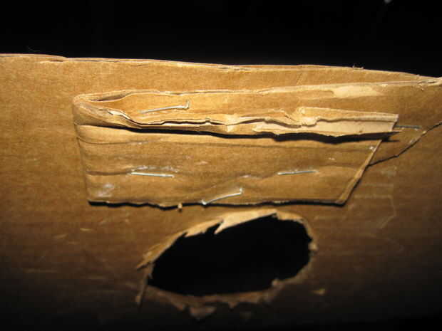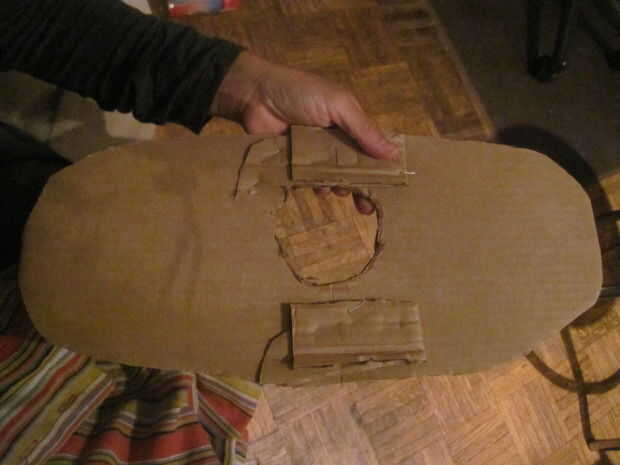 Este es el corazón del traje.  Como puede haber adivinado, hombros humanos tampoco tienen forma son como cajas. Así que corte un trozo de cartón con una longitud que se forma dentro de la camisa comfortabley y siga las siguientes imágenes. Conecte el cartón a la camisa con grapas.