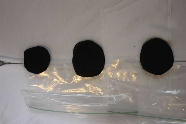Para los botones de cortar 3 círculos irregulares de espuma. Estos estaban pegados a un lado solamente de la parte delantera de la sudadera con capucha. Antes de que estos estaban pegados en puse plástico sobre el lado de la capucha que dejó sin pegar.