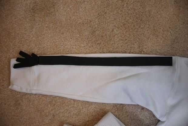 Después de la sudadera con capucha en el piso me midió la longitud de los brazos y cortar tiras de 1/2 para ir de la costura del hombro a la costura de la banda. las manos fueron cortadas del tamaño de los puños. Los brazos y las manos entonces fueron pegadas a la sudadera con capucha con el pegamento GOOP. Comprar GOOP en Home Depot en el Departamento de pintura.