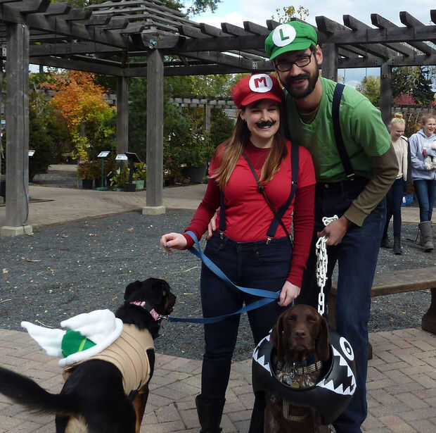 Ligas de la marina de guerra, algunos sombreros del estilo de "vendedor de periódicos" de Amazon (<$ 8 cada uno), una coordinado-camisa de color y un bigote falso. La "M" y la "L" sólo fueron cortadas de blanco fieltro (igual que el Chomp) y pegadas a los sombreros. Simple, fácil y un éxito.