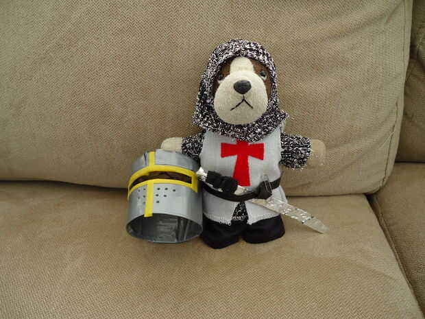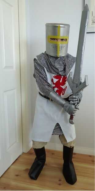nuestro hijo quería ser un caballero este año así que lo hice un poco a la investigación y finalmente vino para arriba con esto. Hice la pista de despegue de vinilo, túnica de tela, "chainmail" con cubierta de la cabeza, cinturón de vinilo, el casco fue un balde de proteína de suero de leche, guanteletes de cinta del conducto y una espada de cinta del conducto. Incluso su perro de peluche, Yapper, tiene juego de disfraces.