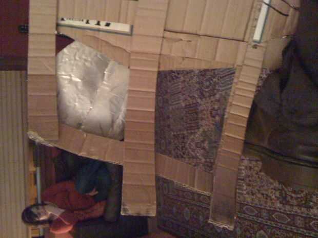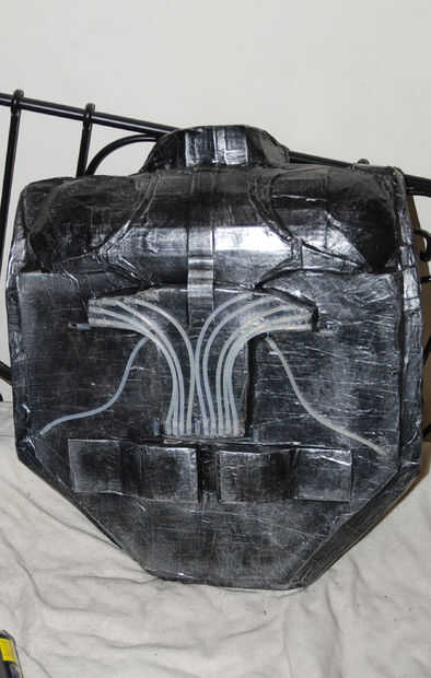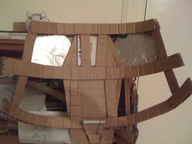 La parte de atrás comenzó como un pedazo grande de cartón pluma rectangular luego recortado en la parte inferior en un triángulo. Luego construí hasta los detalles y la forma con piezas de espuma y tarjeta. la sección redonda en la parte superior de la pieza posterior fue piezas simplemente curvas en capas la sección abovedada con un patrón de cubierta (básicamente cortar tiras triangulares y curva de ellos luego pégalos juntos el resultado le da una forma bonita cúpula) y luego cubrir la totalidad del lote con capas de periódico y pegamento.