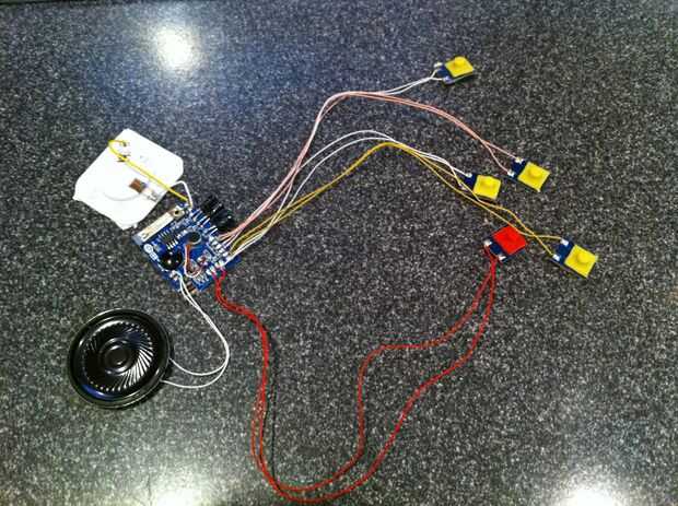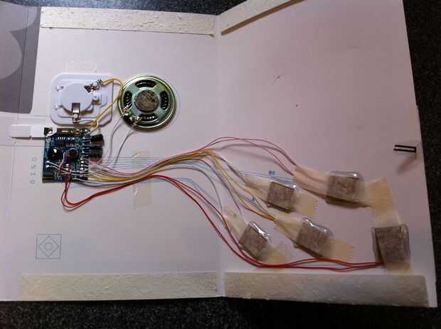 Primer encuentro los sonidos que desea utilizar. Sólo hizo unas pocas búsquedas en google y vino para arriba con un montón. Siga las instrucciones en la tarjeta para cada efecto de sonido del programa en la tarjeta. Después de que sus sonidos se programan cuidadosamente abra la tarjeta para encontrar la tarjeta de sonido. Se pega en bastante bien así que ten cuidado de retirar de la tarjeta.